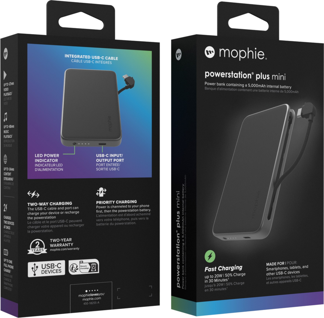 Cette batterie de 5 000mAh est dotée d'un port USB-C de 20W et d'un câble USB-C de 20W intégré. Branchez un smartphone et bénéficiez d'une charge complète. Chargez jusqu'à 50 % en seulement 30 minutes*. Ou chargez deux appareils à la fois à l'aide du port USB-C et du câble intégré. Le chargeur portatif Plus peut être rechargée à l'aide du port USB-C.