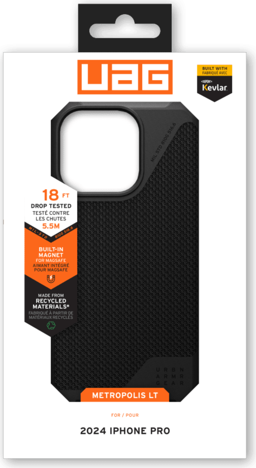 The UAG Metropolis LT case series features a strong TPU frame and an impact-absorbing inner bumper, ensuring comprehensive protection against accidental drops and bumps. With sculpted corners that reinforce drop protection and a stylish DuPont™ KEVLAR® Fiber Inlay, confidently take your device from a meeting to an adventure without skipping a beat. Though it’s not visible on the exterior, the case is equipped with a powerful built-in magnet module, providing seamless compatibility with MagSafe charging. Get ready to experience the perfect harmony of functionality and protection with the Metropolis LT series.