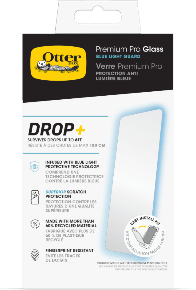 The OtterBox Premium Pro Glass with Blue Light Guard defends displays against scratches, scrapes, and drops up to 6 feet, while also shielding eyes against harmful blue light waves. This blue light screen protector maintains vivid and clear visuals and is made with over 60% recycled material.